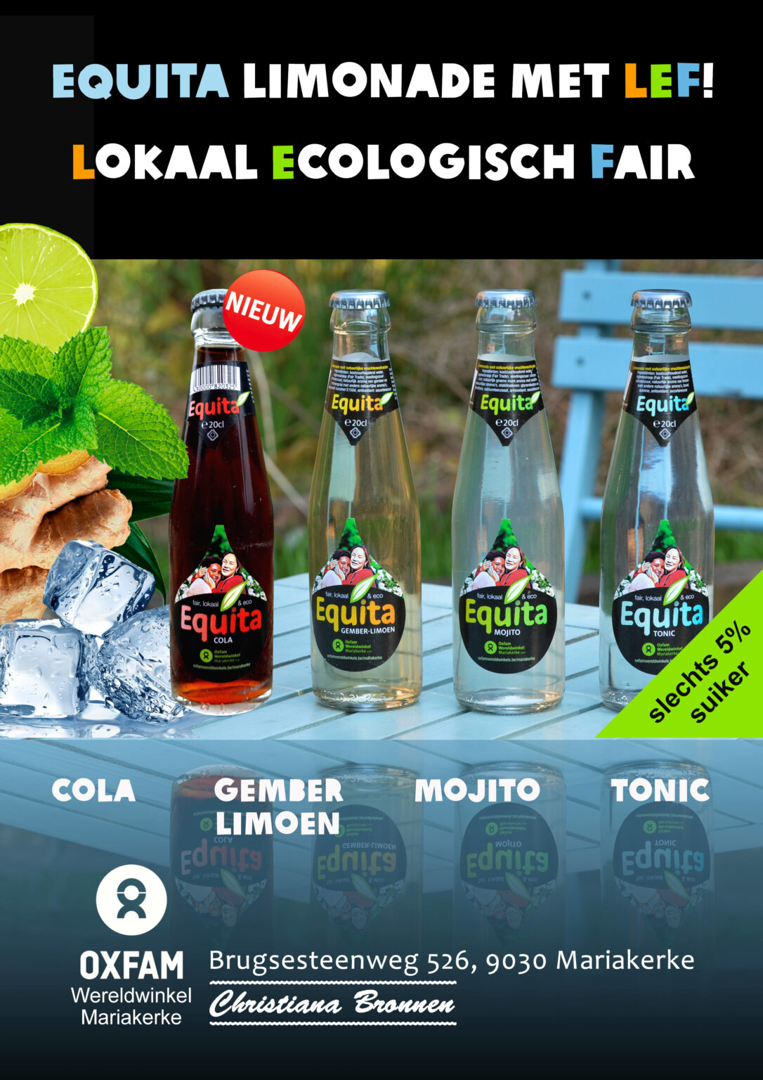 De vrijwilligers van wereldwinkel Mariakerke ontwikkelden in samenwerking met ‘Christiana Bronnen’ (uit Dikkelvenne) deze 3 nieuwe toppers : TONIC, MOJITO en GEMBER-LIMOEN.