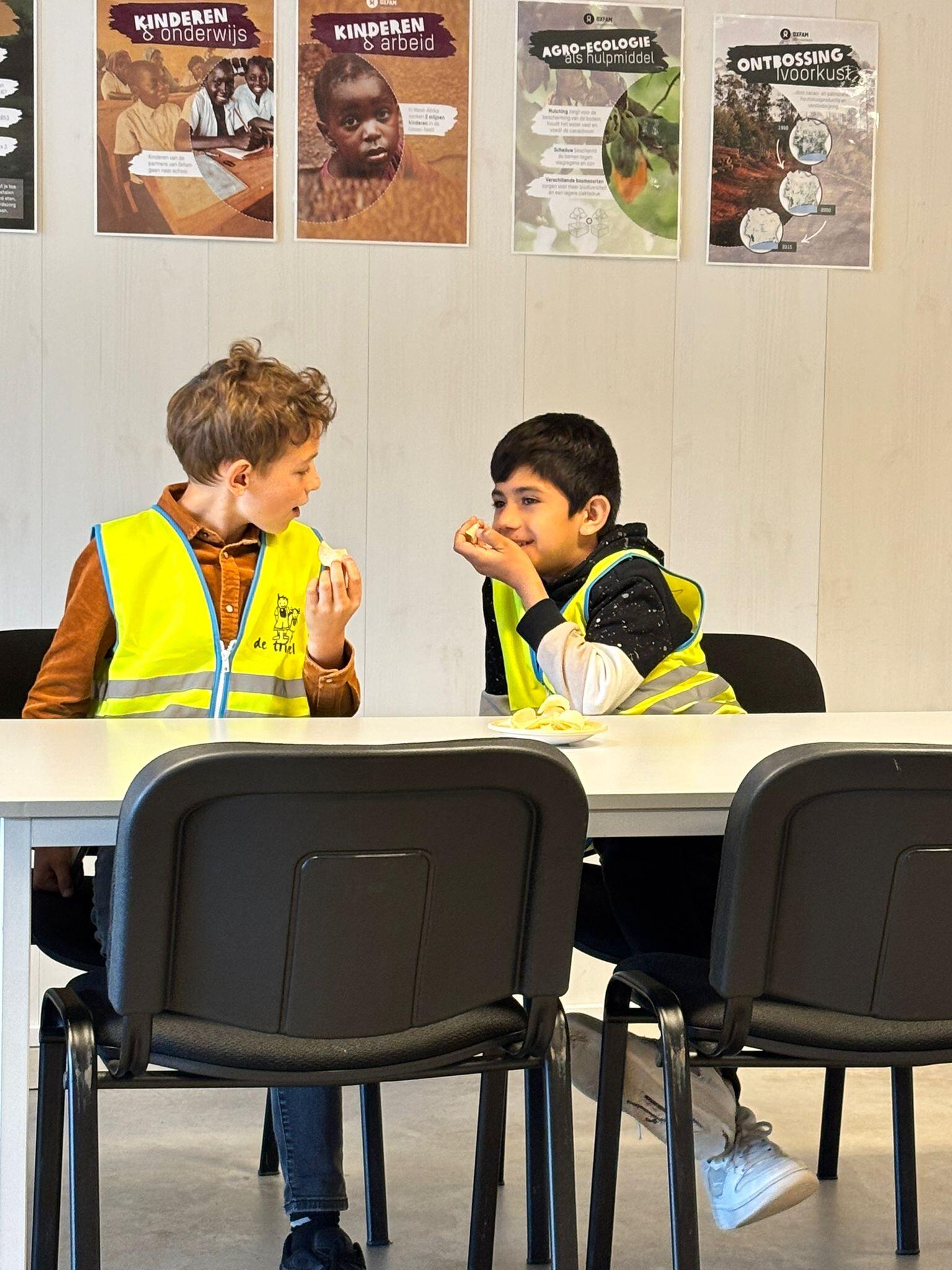 In de klas kregen de kinderen eerst uitleg over de werking van Oxfam en het belang van fairtrade-producten. Ze ontdekten hoe eerlijke handel bijdraagt aan betere leefomstandigheden voor producenten wereldwijd.