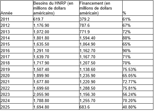 Le Service de suivi financier de l'OCHA des Nations unies présente le plan d'aide humanitaire et d'intervention (HNRP) pour le Soudan du Sud, avec les besoins et les déficits de financement pour chaque année depuis 2011 (voir tableau ci-dessous).