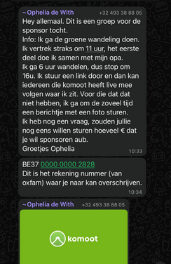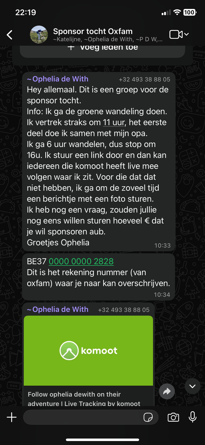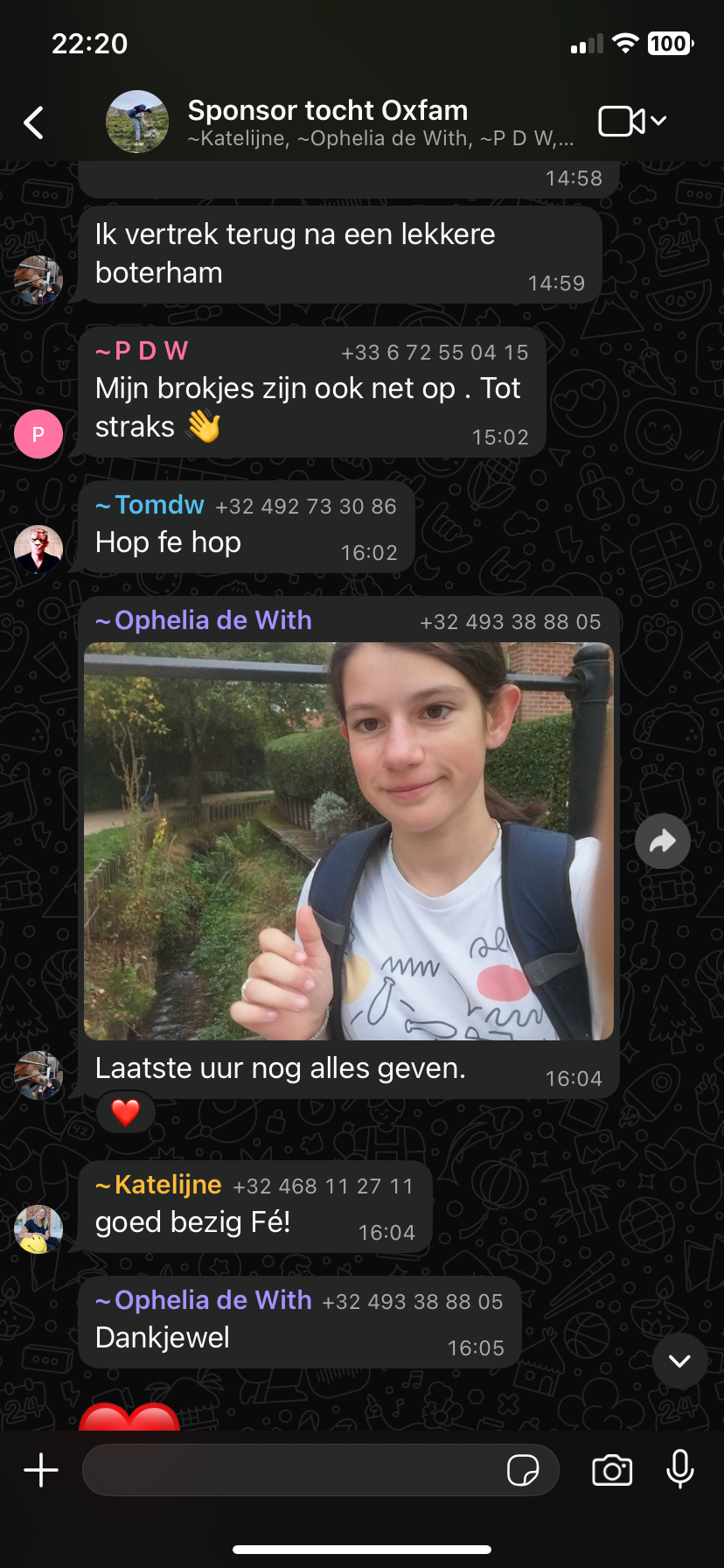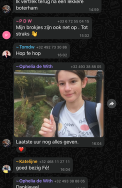 In bijlage foto’s van de whatsapp groep, die voor de gelegenheid gemaakt was.